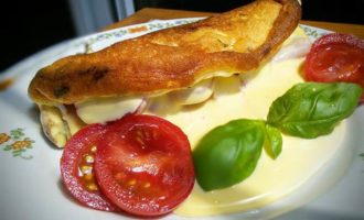 Я делала омлет себе на завтрак, поэтому у меня одна порция, но ингредиенты даю на двоих. А сковородку для такого количества можно взять 26 см в диаметре.