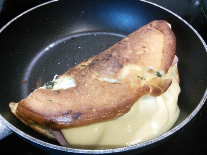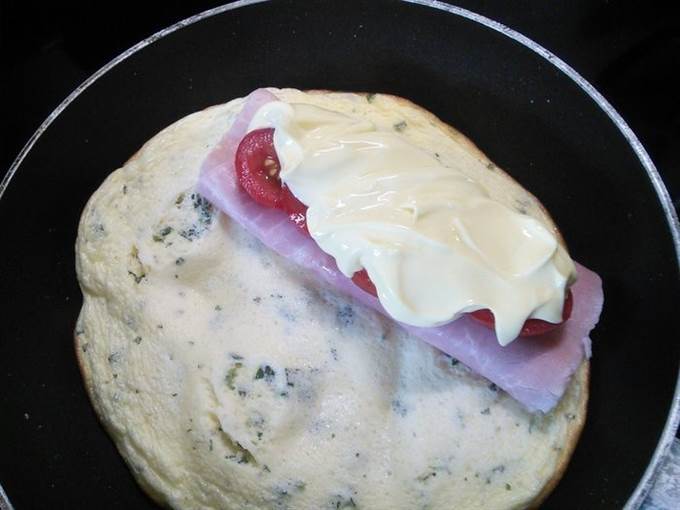 Накрываем второй половиной омлета и допекаем еще 3-4 минуты, пока сыр расплавится.