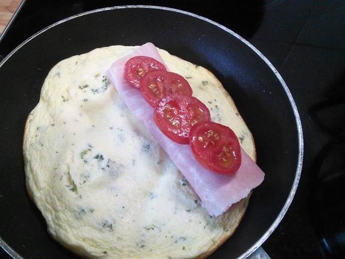 На одну половину омлета выкладываем ветчину, для сочности я добавила помидор.
