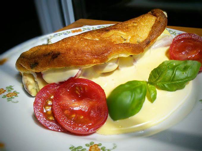Я делала омлет себе на завтрак, поэтому у меня одна порция, но ингредиенты даю на двоих. А сковородку для такого количества можно взять 26 см в диаметре.