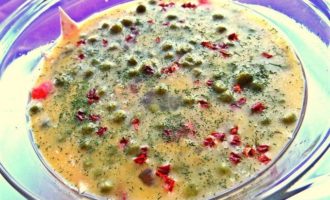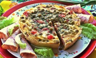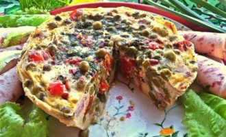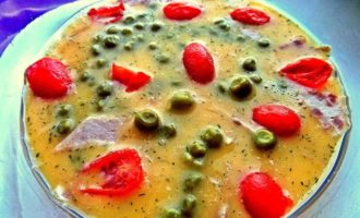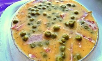 Выливаем бОльшую часть омлета в форму (12 см) для СВЧ, высыпаем ветчину и горошек.