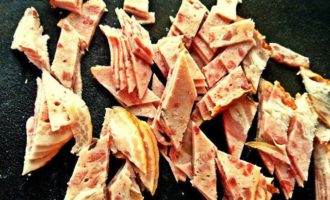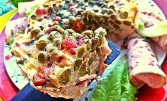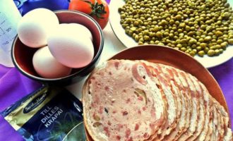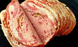 На самом деле берём 5 ломтиков любой колбасы, мяса, ветчины, можно даже готовую куриную грудку!
