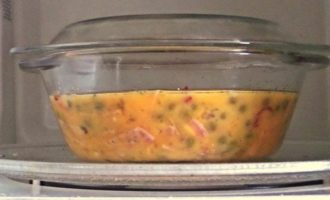 Накрываем стеклянной крышкой и запекаем в СВЧ 5 минут при 750 W.