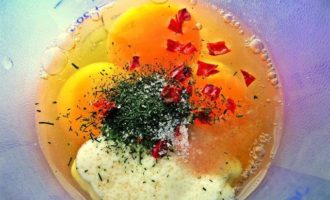 В шейкер вбиваем яйца, добавляем сметану, воду, укроп острого перчика, кто любит.