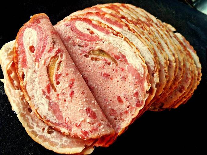 На самом деле берём 5 ломтиков любой колбасы, мяса, ветчины, можно даже готовую куриную грудку!