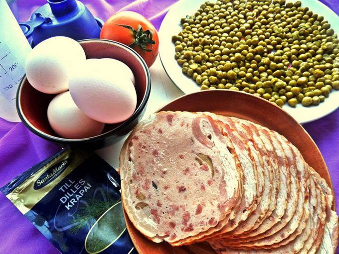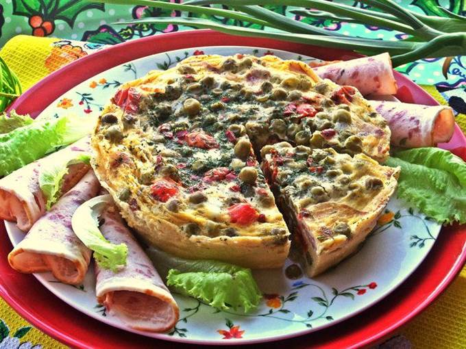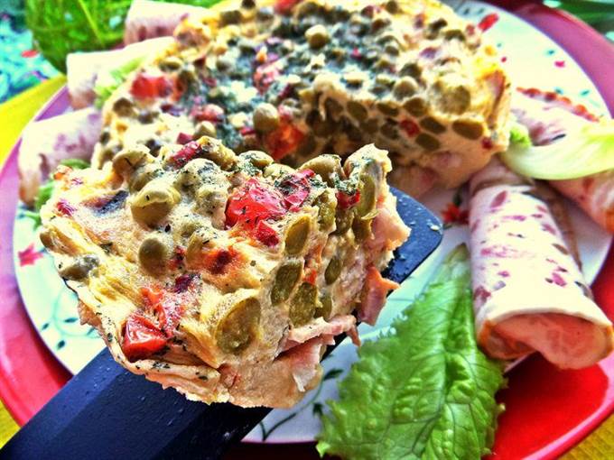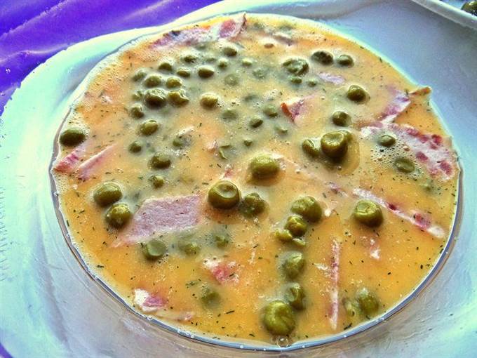 Выливаем бОльшую часть омлета в форму (12 см) для СВЧ, высыпаем ветчину и горошек.