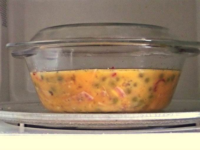 Накрываем стеклянной крышкой и запекаем в СВЧ 5 минут при 750 W.