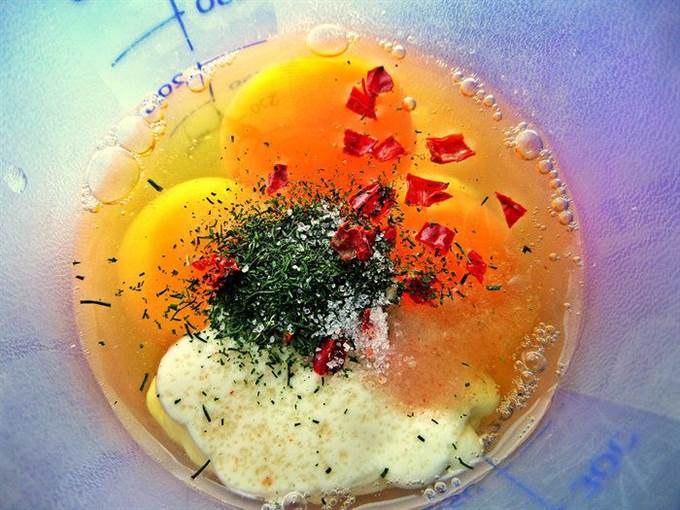 В шейкер вбиваем яйца, добавляем сметану, воду, укроп острого перчика, кто любит.