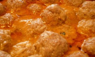 • Снимаем крышку, добавляем зелень, щепотку сахара, щепотку сухой аджики, перемешиваем, пробуем на соль, если надо добавляем соли. Из фарша формуем шарики величиной с грецкий орех, выкладываем их поверх овощей, закрываем крышкой и еще тушим 10-15 минут.