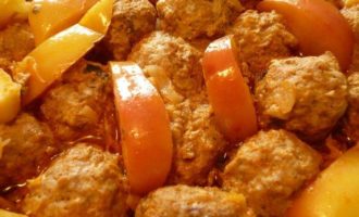 • Яблоко очистить от семян, нарезать его дольками и выкладываем дольки в казан между фрикадельками, закрываем крышкой и еще тушим 10 минут. Выключаем огонь, даем блюду еще настояться минут 5 под крышкой и можно приступать к трапезе.