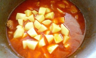 • Я готовлю это блюдо и обжариваю все продукты сразу в казане. У кого нет казана, можете обжаривать все на сковороде, а тушить в любой другой посуде. Лук нарезать мелким кубиком, морковь кусочками. Ставим казан на плиту на средний огонь, наливаем растительное масло, нагреваем, затем выкладываем лук, помешивая, обжарим 2-3 минуты. Затем добавим морковь и еще обжарим 2-3 минуты. Добавляем томатную пасту, перемешаем и обжарим, помешивая, примерно минуту, затем добавляем натертые на крупной терке помидоры. Тушим, помешивая, до испарения жидкости (10-15 мин.) и следим, чтобы не подгорело. Добавляем горячую воду из чайника, чтобы она полностью закрыла овощи. Солим, перчим, добавляем лавровый лист, уменьшаем огонь до минимума и тушим 20 минут. Если надо, добавляем во время тушения воду. Блюдо должно быть не сухим, а похожим на очень густой суп. Чистим картофель, нарезаем его небольшими кубиками и выкладываем в казан. Тушим еще 10-15 минут.