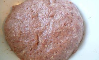 • Готовим фарш: чеснок измельчить, луковицу натереть на крупной терке, добавить к фаршу, добавить хлопья, яйцо, соль и молотый перец, хорошо перемешать и слегка отбить.