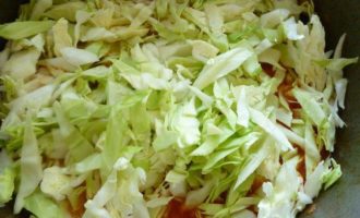 • Капусту нарезать не очень мелко. Выкладываем ровным слоем поверх картофеля, закрываем крышкой, тушим 10 минут.