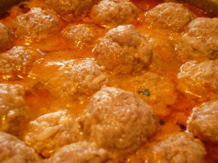 • Снимаем крышку, добавляем зелень, щепотку сахара, щепотку сухой аджики, перемешиваем, пробуем на соль, если надо добавляем соли. Из фарша формуем шарики величиной с грецкий орех, выкладываем их поверх овощей, закрываем крышкой и еще тушим 10-15 минут.