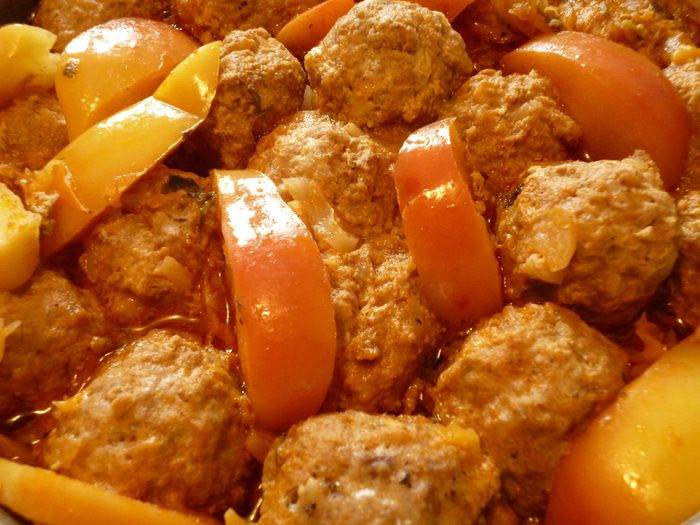 • Яблоко очистить от семян, нарезать его дольками и выкладываем дольки в казан между фрикадельками, закрываем крышкой и еще тушим 10 минут. Выключаем огонь, даем блюду еще настояться минут 5 под крышкой и можно приступать к трапезе.