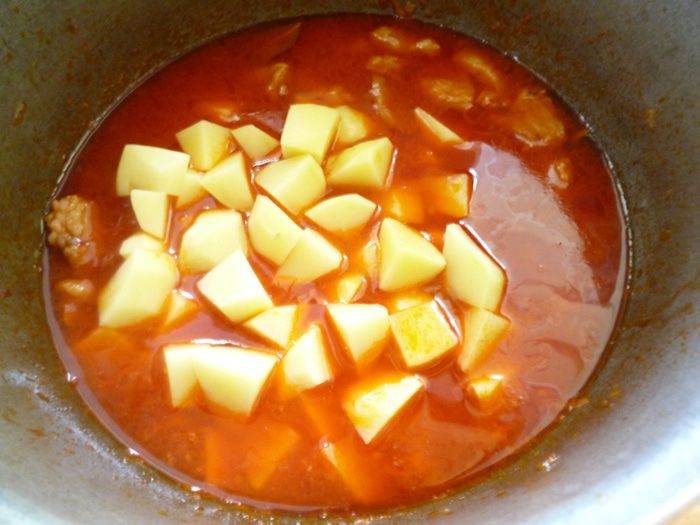 • Я готовлю это блюдо и обжариваю все продукты сразу в казане. У кого нет казана, можете обжаривать все на сковороде, а тушить в любой другой посуде. Лук нарезать мелким кубиком, морковь кусочками. Ставим казан на плиту на средний огонь, наливаем растительное масло, нагреваем, затем выкладываем лук, помешивая, обжарим 2-3 минуты. Затем добавим морковь и еще обжарим 2-3 минуты. Добавляем томатную пасту, перемешаем и обжарим, помешивая, примерно минуту, затем добавляем натертые на крупной терке помидоры. Тушим, помешивая, до испарения жидкости (10-15 мин.) и следим, чтобы не подгорело. Добавляем горячую воду из чайника, чтобы она полностью закрыла овощи. Солим, перчим, добавляем лавровый лист, уменьшаем огонь до минимума и тушим 20 минут. Если надо, добавляем во время тушения воду. Блюдо должно быть не сухим, а похожим на очень густой суп. Чистим картофель, нарезаем его небольшими кубиками и выкладываем в казан. Тушим еще 10-15 минут.