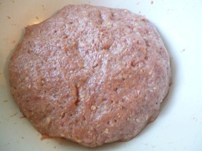 • Готовим фарш: чеснок измельчить, луковицу натереть на крупной терке, добавить к фаршу, добавить хлопья, яйцо, соль и молотый перец, хорошо перемешать и слегка отбить.