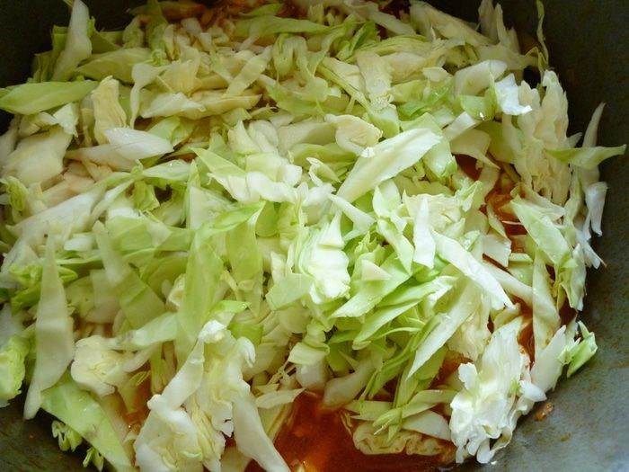• Капусту нарезать не очень мелко. Выкладываем ровным слоем поверх картофеля, закрываем крышкой, тушим 10 минут.
