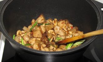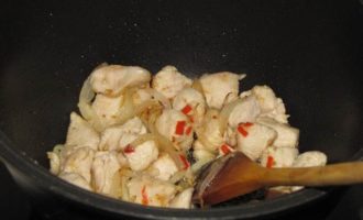 Разогреем в воке или сотейнике, растительное масло, обжарим в нем острый перец и чеснок в течении 30 Секунд, добавим кусочки курицы и репчатый лук. Жарим 5 минут, постоянно помешивая.