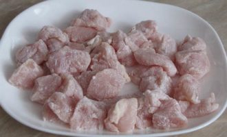 Куриное филе нарежем кубиками со стороной 2 см и обваляем их в крахмале.