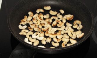 Добавим ананасы, нарезанные на небольшие кусочки, и орехи. Добавим соевый соус, бальзамический уксус и 2 ст. л. ананасового сока из банки. Хорошо перемешаем, убавим огонь и тушим еще три минуты, не закрывая крышку и помешивая. В самом конце добавим зеленый лук и снимем блюдо с огня.