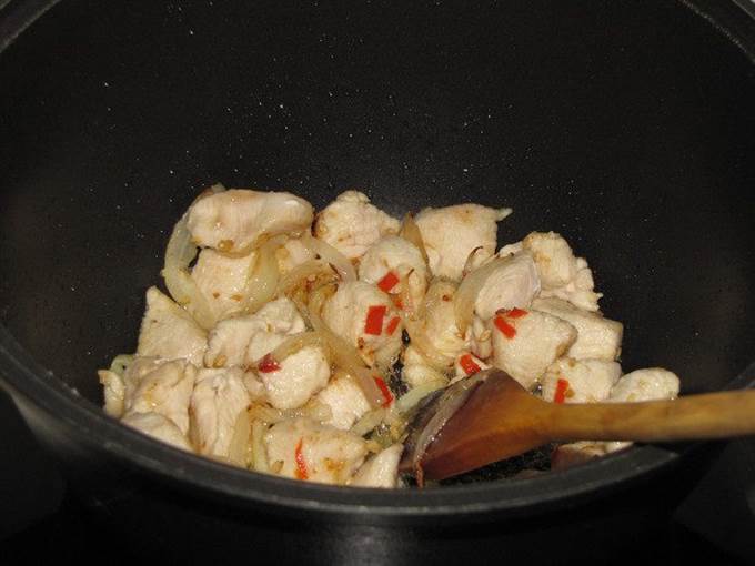 Разогреем в воке или сотейнике, растительное масло, обжарим в нем острый перец и чеснок в течении 30 Секунд, добавим кусочки курицы и репчатый лук. Жарим 5 минут, постоянно помешивая.
