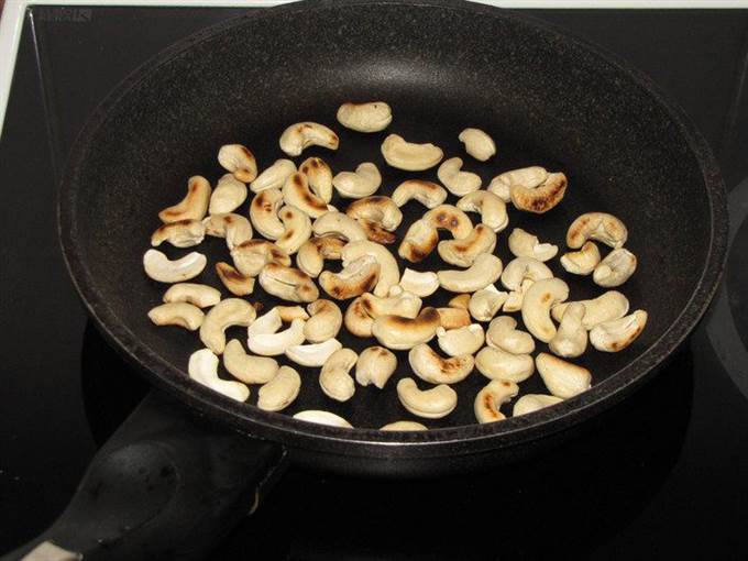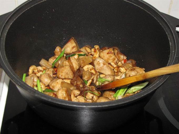 Добавим ананасы, нарезанные на небольшие кусочки, и орехи. Добавим соевый соус, бальзамический уксус и 2 ст. л. ананасового сока из банки. Хорошо перемешаем, убавим огонь и тушим еще три минуты, не закрывая крышку и помешивая. В самом конце добавим зеленый лук и снимем блюдо с огня.