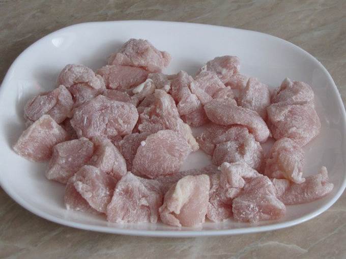 Куриное филе нарежем кубиками со стороной 2 см и обваляем их в крахмале.