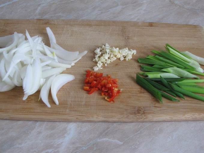 Репчатый лук нарежем дольками, зеленый лук перьями, чеснок и острый перчик измельчим. Количество красного перца можно регулировать по своему вкусу.