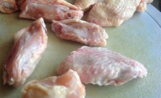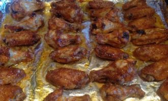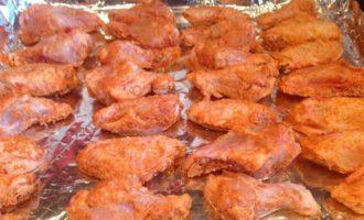 Выложите крылышки на противень застеленный фольгой и смазанный растительным маслом. Поставьте в духовку на 20 минут.