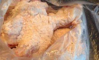 Положите куриные крылышки, в кулек сверху высыпьте сухую смесь и хорошо перемешайте.