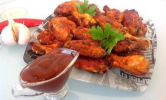 Достаньте крылышки из духовки, смажьте глазурью и поставьте обратно на 5 минут. После чего переверните, опять смажьте глазурью и запекайте еще 5 минут.