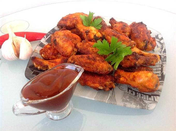 Достаньте крылышки из духовки, смажьте глазурью и поставьте обратно на 5 минут. После чего переверните, опять смажьте глазурью и запекайте еще 5 минут.