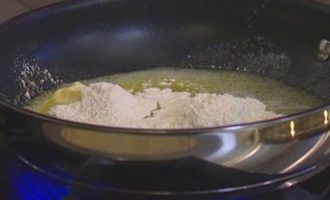 Приготовить соус: сливочное масло растопить, смешать с мукой и немного прогреть, затем постепенно влить молоко и, помешивая, готовить на умеренном огне, пока не получится однородная консистенция.
