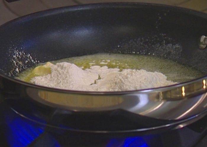 Приготовить соус: сливочное масло растопить, смешать с мукой и немного прогреть, затем постепенно влить молоко и, помешивая, готовить на умеренном огне, пока не получится однородная консистенция.