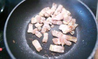 Бекон поджарить на сковороде до румяной корочки.