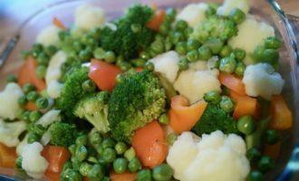 Все овощи, кроме болгарского перца, отварить в подсоленной воде в течении 3 мин. Откинуть на дуршлаг, дать стечь жидкости и уложить в форму для запекания, смазанную маслом.