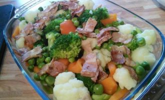 Разложить бекон на овощи.