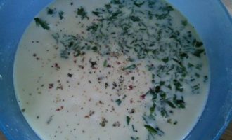 Яйца взбить с молоком и сливками, посолить, поперчить, добавить мелко порубленную зелень петрушки.