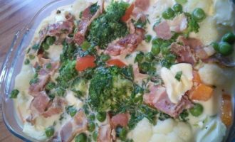 Овощи залить яично-молочной смесью, посыпать натертым сыром. Запекать в разогретой духовке при температуре 180° в течении 30-40 мин. до золотистой корочки.