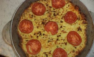 Помидоры порезать кружочками. Выложить сверху на запеканку, форму поставить под гриль и запекать ещё 5 минут.
