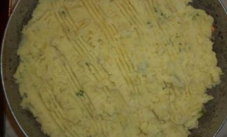 Сверху ровным слоем выложить картофельное пюре, разровнять и сделать вилкой на поверхности узоры.