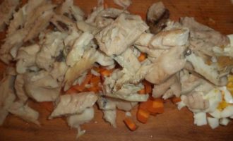 Перемешать морковь, яйца и рыбу, посолить и поперчить, перемешать.