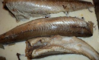Форму для запекания смазать маслом, выложить рыбу (я взяла вместо филе 3 тушки хека). Влить в форму 500 мл молока, добавить разрезанную на четвертушки луковицу, лавровые листочки, гвоздику, перец горошком, рыбу присолить. Запекать 20 минут.