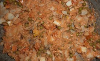 Снять соус с огня, добавить в соус рыбу, яйца, морковь, зеленый горошек, перемешать. Выложить эту смесь в смазанную маслом форму для запекания.