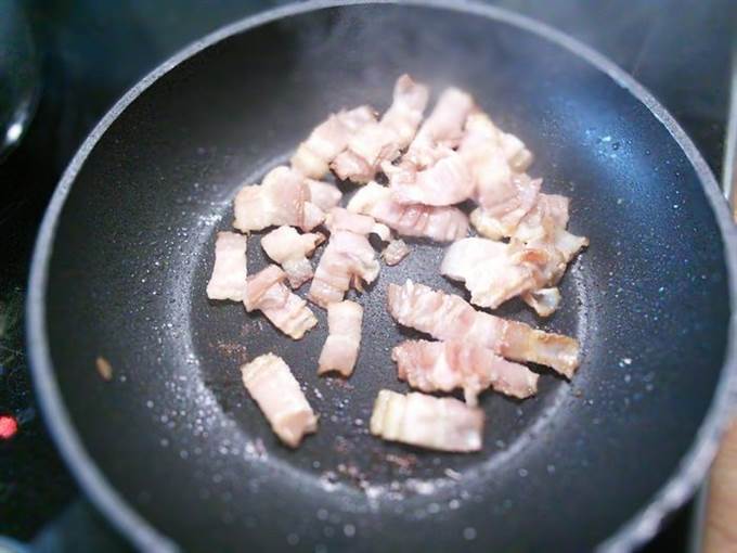 Бекон поджарить на сковороде до румяной корочки.