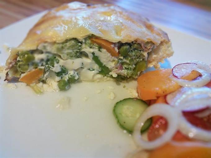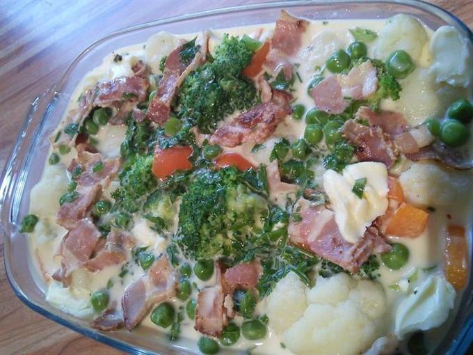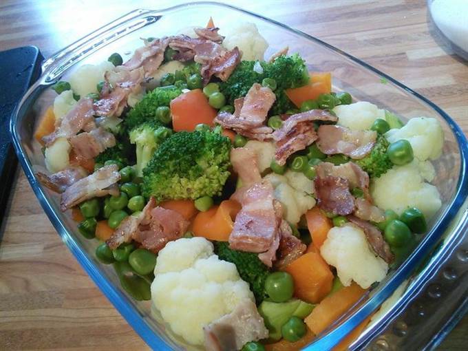 Разложить бекон на овощи.