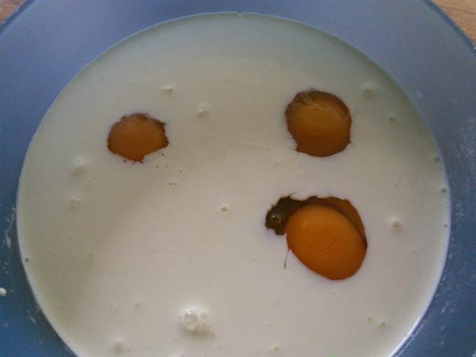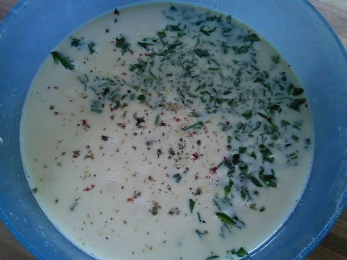 Яйца взбить с молоком и сливками, посолить, поперчить, добавить мелко порубленную зелень петрушки.