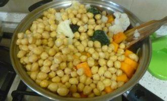 Добавить нут, цветную капусту, шпинат, пасту карри и налить немного кипятка. Готовить под крышкой, время от времени перемешивая, до готовности овощей.