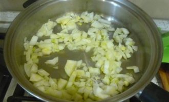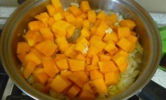 Лук мелко нарезать, тыкву нарезать кубиками. В большом сотейнике разогреть масло, обжарить лук.
